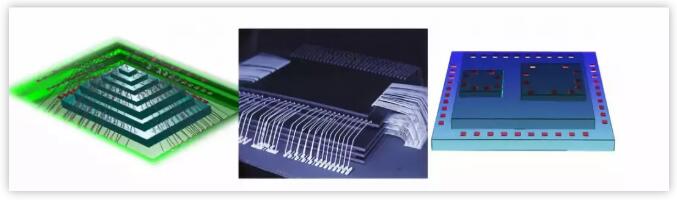 3D IC的初期型態(tài),目前仍廣泛應(yīng)用于SiP領(lǐng)域,是將功能相同的裸芯片從下至上堆在一起,形成3D堆疊,再由兩側(cè)的鍵合線連接,最后以系統(tǒng)級封裝(System-in-Package,SiP)的外觀呈現(xiàn)。堆疊的方式可為金字塔形、懸臂形、并排堆疊等多種方式,參看下圖。
