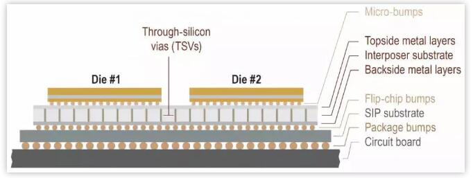 在SiP基板與裸芯片之間放置一個(gè)中介層(interposer)硅基板,中介層具備硅通孔(TSV),通過TSV連結(jié)硅基板上方與下方表面的金屬層。有人將這種技術(shù)稱為2.5D,因?yàn)樽鳛橹薪閷拥墓杌迨菬o源被動(dòng)元件,TSV硅通孔并沒有打在芯片本身上。如下圖所示:
