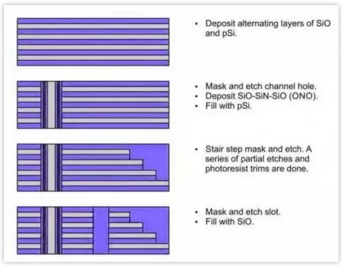東芝開發(fā)了 Bit Cost Scalable(BiCS)的工藝。BiCS 工藝采用了一種先柵極方法(gate-first approach),這是通過交替沉積氧化物(SiO)層和多晶硅(pSi)層實(shí)現(xiàn)的。然后在這個(gè)層堆疊中形成一個(gè)通道孔,并填充氧化物-氮化物-氧化物(ONO)和 pSi。然后沉積光刻膠,通過一個(gè)連續(xù)的蝕刻流程,光刻膠修整并蝕刻出一個(gè)階梯,形成互連。最后再蝕刻出一個(gè)槽并填充氧化物。如下圖所示: