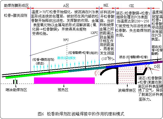 活性松香助焊劑在波峰焊接中的作用機(jī)理與模式的描述如圖7所示。